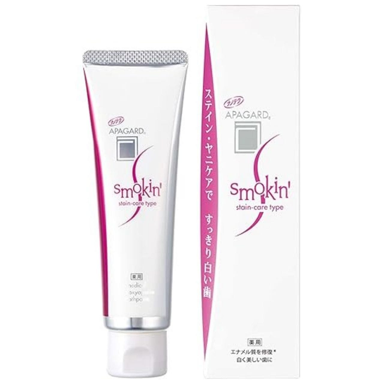 Japanese toothpaste with a dual stain removal system and hydroxyapatite. Metaphosphate and sodium citrate effectively eliminate stubborn stains, while pearl extract brightens teeth. Delicate jasmine mint flavour.