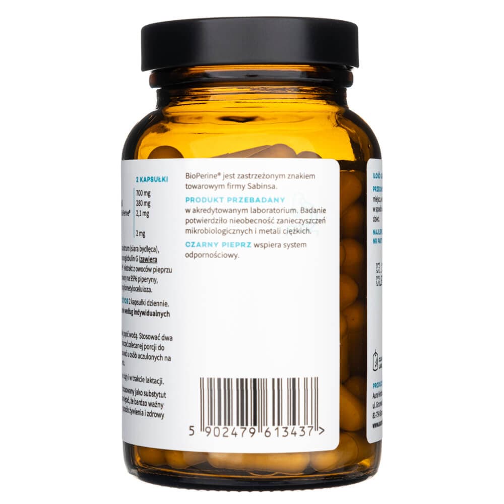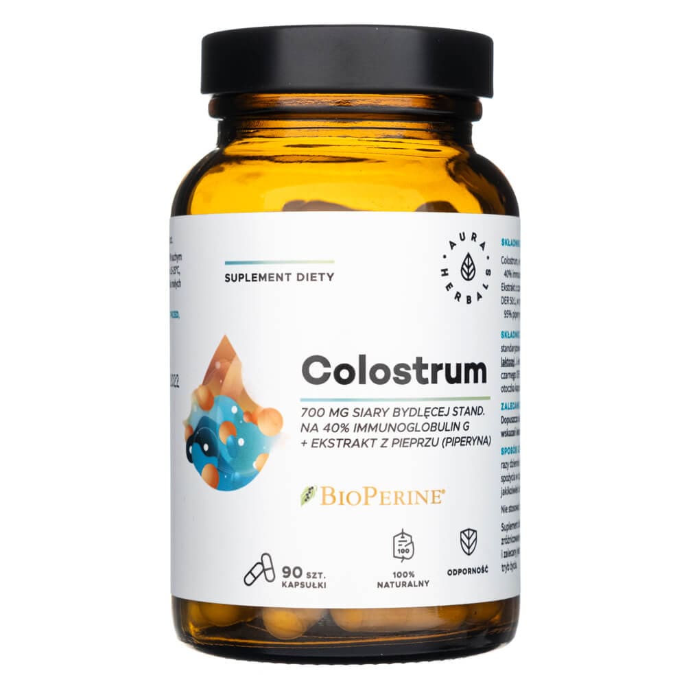 Colostrum is a dietary supplement in capsules from Aura Herbals, containing 700 mg of bovine colostrum standardized to 40% immunoglobulin G, with the addition of branded BioPerine® black pepper extract standardized to 95% piperine. The black pepper in the supplement aids digestion and nutrient absorption, and enhances the effectiveness of other herbal ingredients.