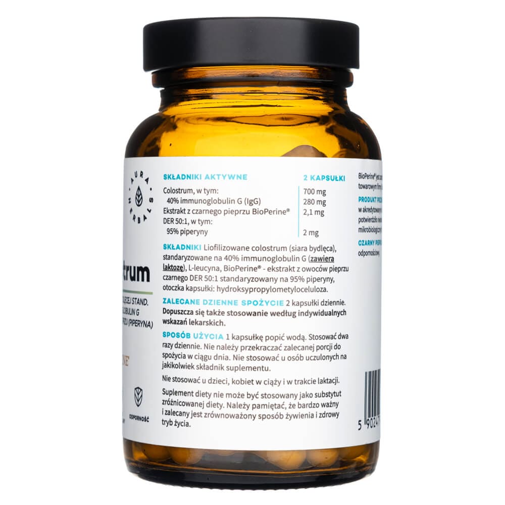 Lyophilized colostrum - bovine colostrum, standardized to 40% immunoglobulin G (contains lactose), L-leucine, BioPerine® - black pepper fruit extract DER 50:1 standardized to 95% piperine, capsule shell: hydroxypropylmethylcellulose.