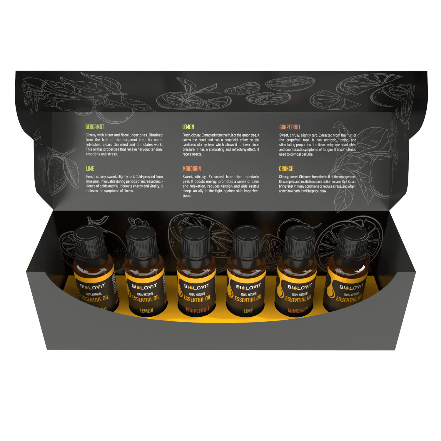 The elegant black and yellow box holds up to six 100% natural essential oils by Bilovit. The set has been designed with great care so that it is ready to be given as a gift, and so that the included oils do not move during transport.