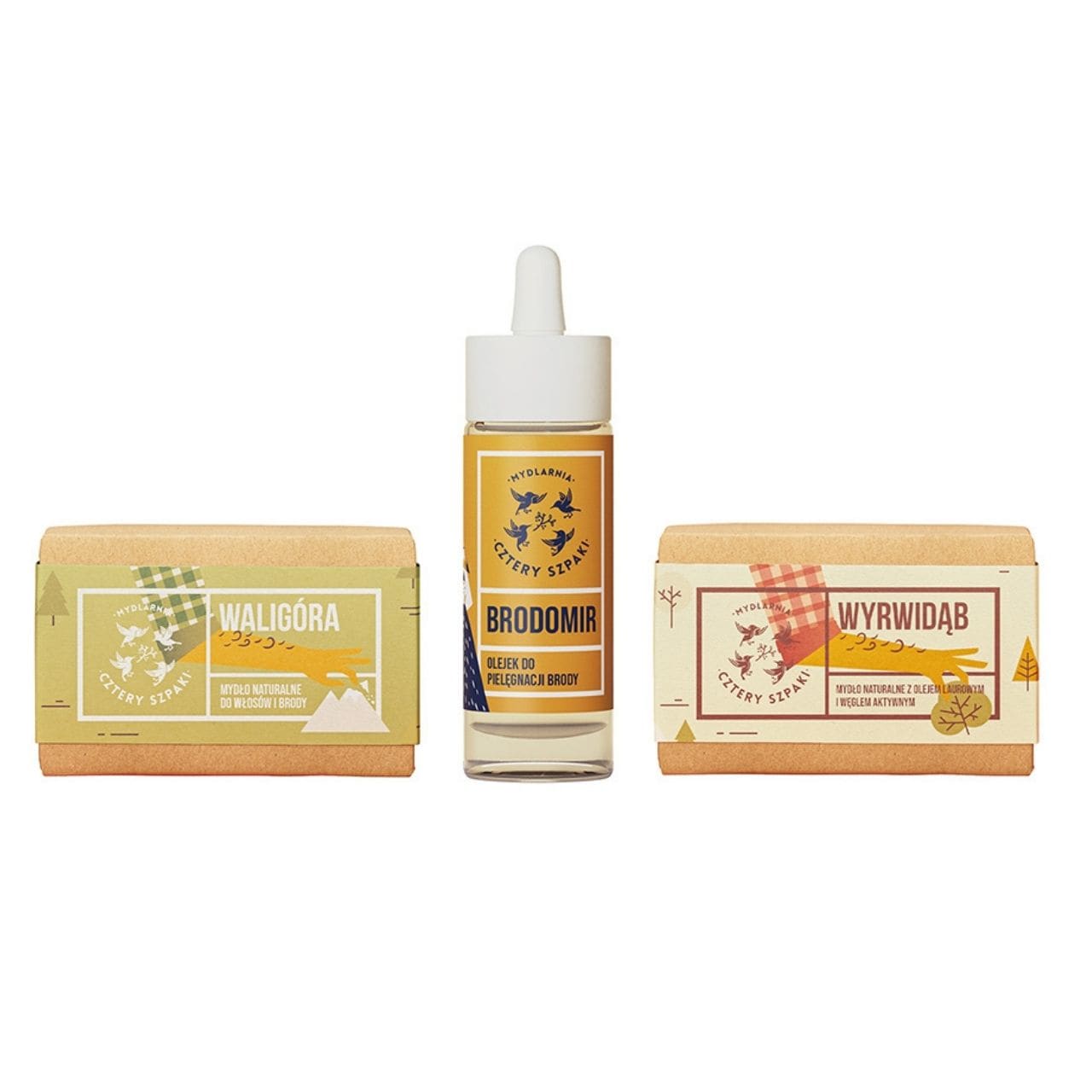 The philosophy behind the set is simplicity and effectiveness without compromise. No unnecessary ingredients, artificial fragrances or colours - just pure, natural vegan cosmetics that work. Brodomir oil softens and nourishes facial hair, Waligóra soap cleanses the beard without stripping it of its natural oils, and Wyrwidąb with charcoal deeply cleanses the skin of the entire body. This is care that every man will appreciate.