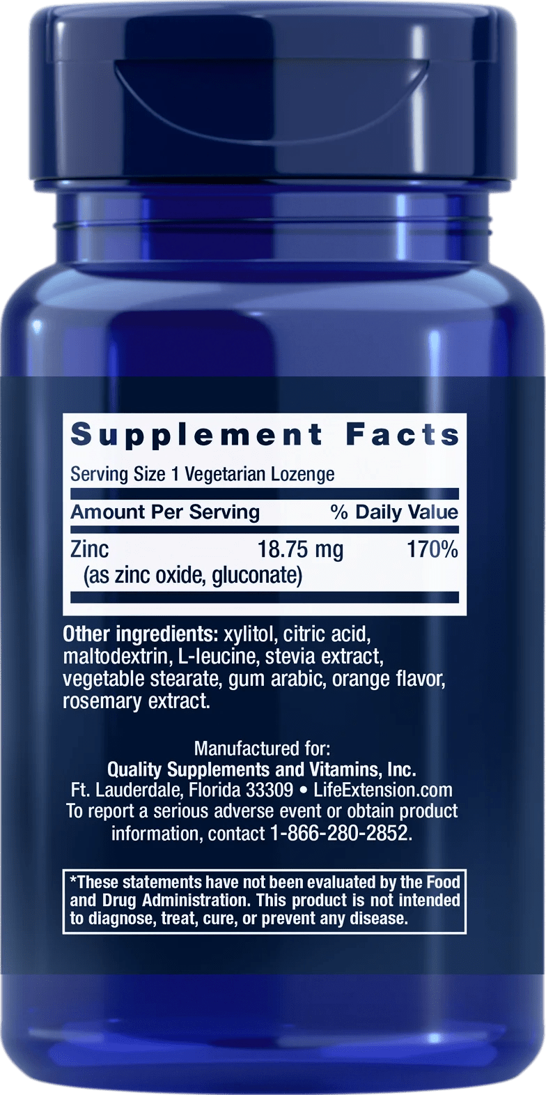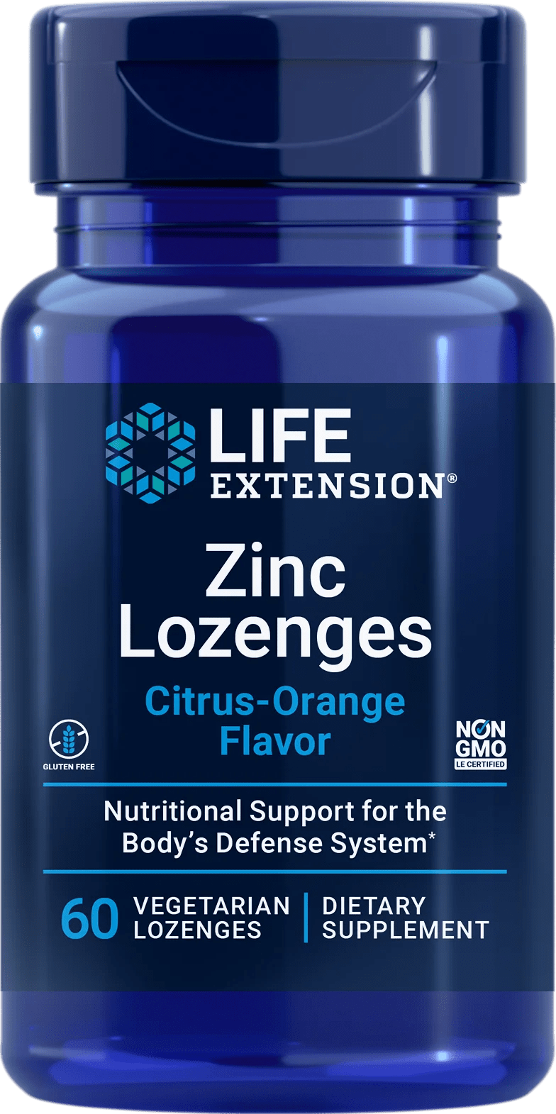 Zinc Lozenges from Life Extension is a dietary supplement in lozenges with a citrus-orange flavor, containing zinc in the form of zinc oxide and zinc gluconate.