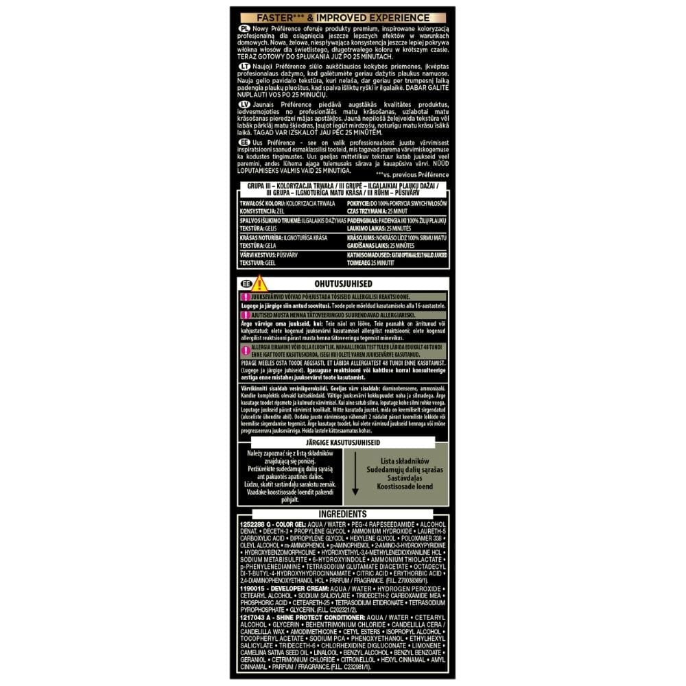 L'Oréal Paris Preference is an innovative permanent hair color with an anti-fade system. The new gel formula with oil provides up to 8 weeks of intense, shiny color and up to 100% gray hair coverage. The product offers professional at-home results, is ready to rinse out in just 25 minutes and contains a Shine Protecting Conditioner enriched with UV filter and vitamin E derivative.