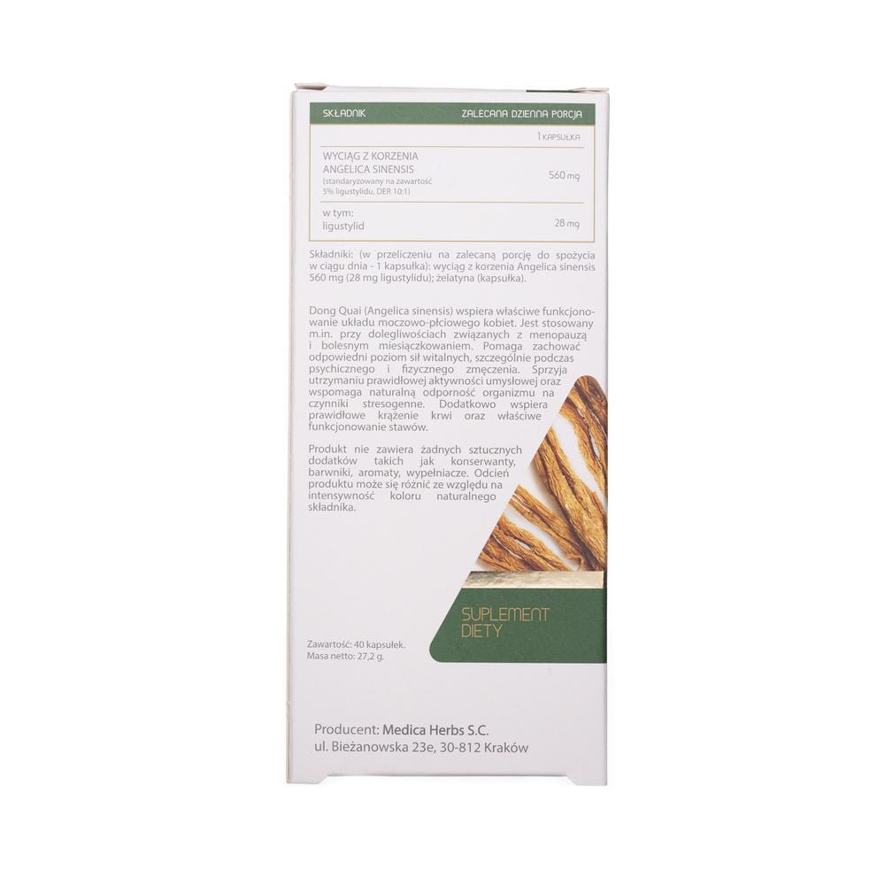 Medica Herbs Dong Quai is a dietary supplement in capsule form, containing a 5% standardized extract of ligustilide derived from the root of Angelica sinensis. Dong Quai, also known as Angelica sinensis, is a plant commonly used in traditional Chinese medicine for its potential health benefits. It has been studied for its ability to support women's health, particularly during menopause.