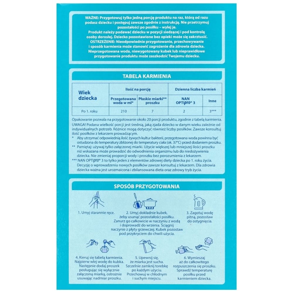 NAN OPTIpro 3 is a milk-based product intended for young children. Enriched with vitamins and minerals. It is not a substitute for breast milk, but a product created with children over 1 year of age in mind