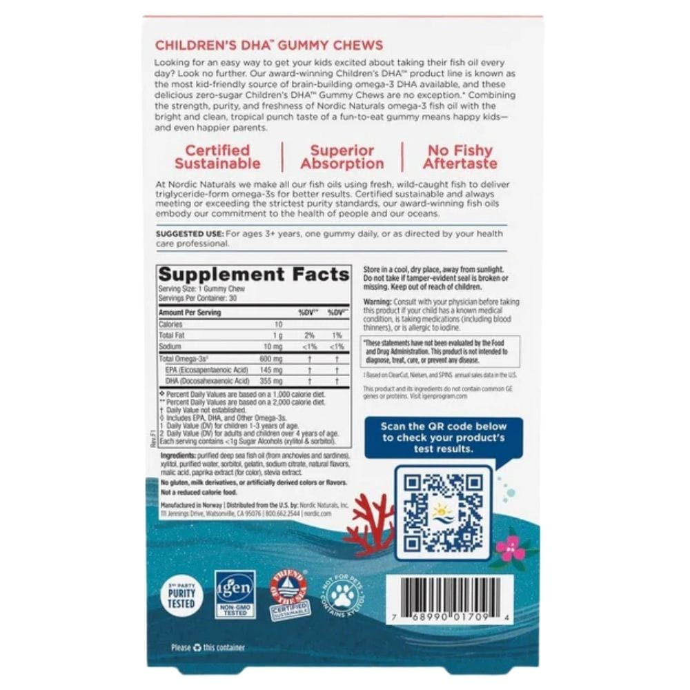 Nordic Naturals Children's DHA is a dietary supplement in delicious tropical fruit-flavoured gummies. Specially formulated for children aged 3 and up. Contains Omega-3 fatty acids (DHA + EPA) with no added sugar. The product provides 600 mg of omega-3 fatty acids per serving.