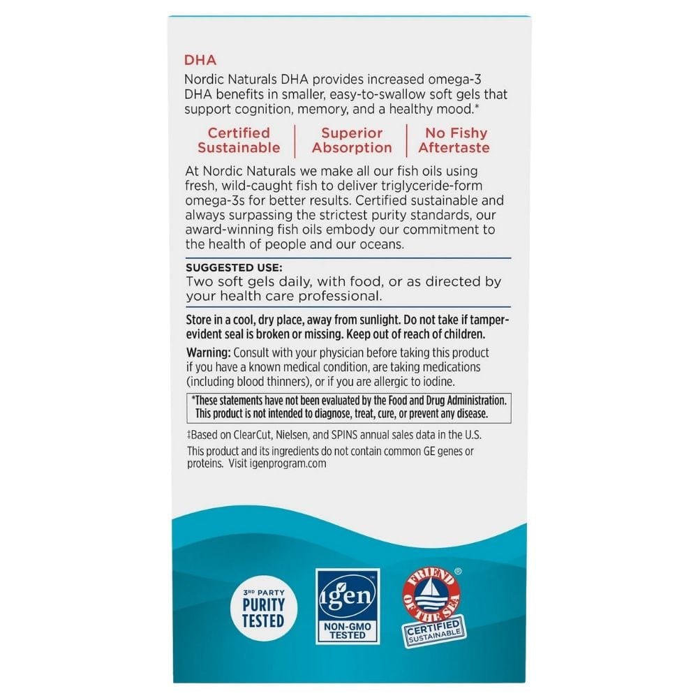 Nordic Naturals DHA is a dietary supplement in gel capsules. The formula provides 830 mg of Omega-3, including as much as 480 mg of DHA (docosahexaenoic acid).