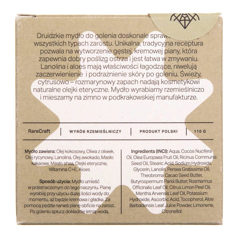 Lanolin and aloe vera have soothing properties, eliminating redness and irritation of the skin after shaving. The fresh, citrusy and rosemary scent is imparted to the cosmetic by naturale essential oils. The avocado and castor oils nourish and moisturise the skin, as well as regulating its pH. Druid Shaving Soap is free of artificial preservatives and irritants and is therefore also suitable for those prone to allergies and irritations. Its unique recipe and craftsmanship make it a unique, Polish cosmetic.