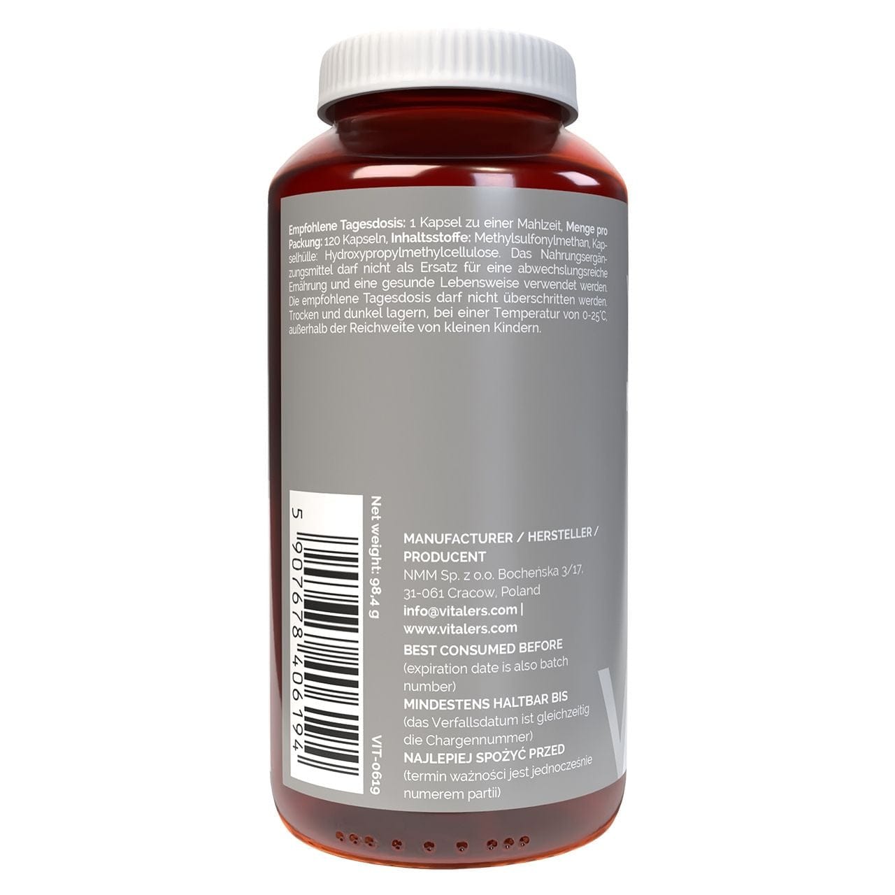 Vitaler's MSM (Organic Sulphur) 700 mg is a dietary supplement in capsule form containing 700 mg of methylsulfonylmethane (MSM) in each capsule. MSM is an organic sulphur compound found naturally in certain fruits and vegetables, among other foods. HPMC capsules suitable for vegetarians and vegans. 120 capsules per pack. Does not contain: preservatives, flavourings, colourings, added sugar.