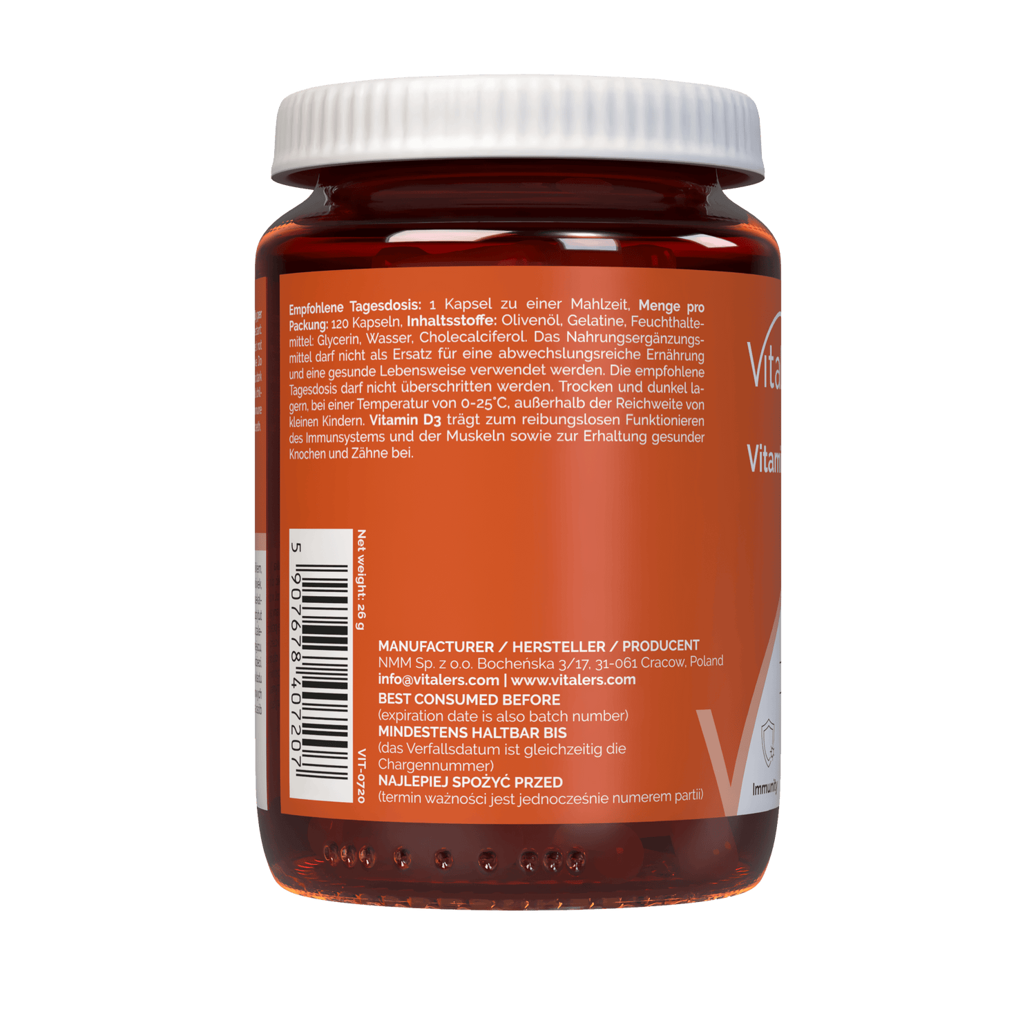 Vitaler's Vitamin D3 4000 IU is a dietary supplement in capsules containing vitamin D3 derived from lanolin. Vitamin D helps in the proper functioning of the immune system, muscles, and in maintaining healthy bones and teeth.